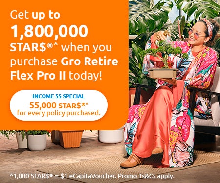 ^1,000 STAR$® = $1 eCapitaVoucher. To qualify for the STAR$®, you have to sign up for a Regular Premium Gro Retire Flex Pro II Insurance Savings Plans, including any applicable rider(s) (“Qualifying Policy”) during the promotion period and meet the corresponding minimum monthly premium and premium payment term as set out above. Each successful customer would only be entitled to receive the STAR$® once for each Qualifying Policy. Other terms and conditions apply.