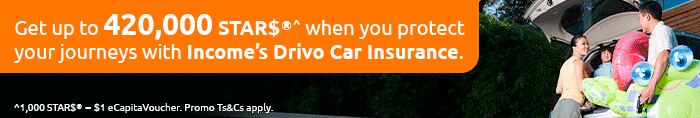This is for general information only. You can find the usual terms, conditions and exclusions of Drivo Classic, Drivo Advantage and Drivo Premium plans at income.com.sg/car-policy-conditions.pdf, Prestige plan at income.com.sg/car-prestige-policy-conditions.pdf and Motor Insurance Extensions (Rider) at income.com.sg/car-rider-policy-conditions.pdf.