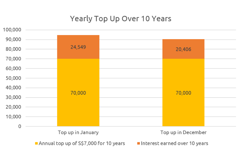 Example 1: Lump sum top up of S$7,000 in January vs lump sum top up of S$7,000 in December over 10 years