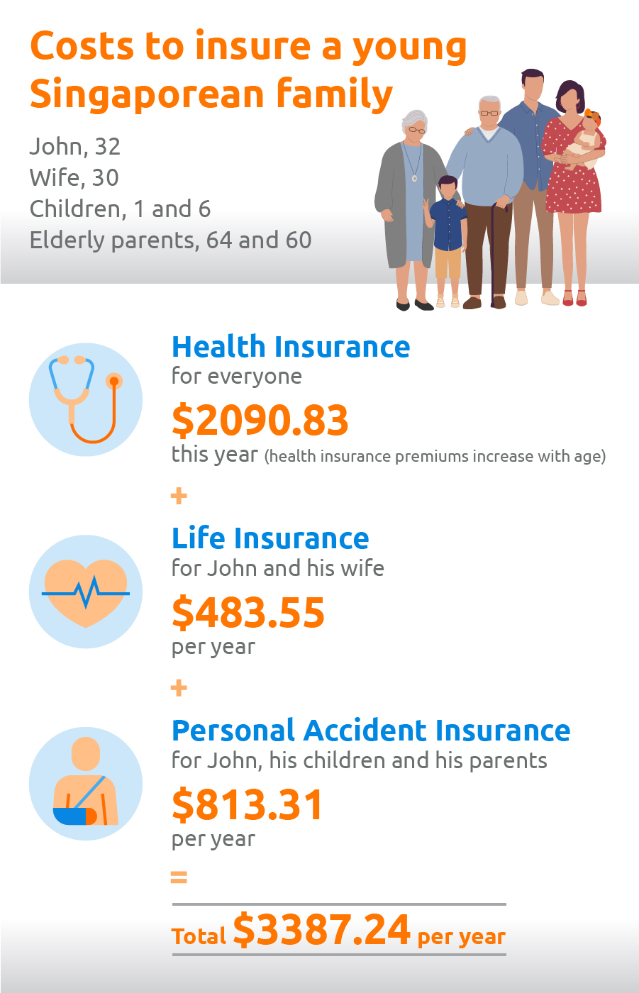 As his parents age, John is also conscious of the fact that they’re more prone to falls and may need additional care, so he has SilverCare personal accident insurance plans for them both. Since he got them coverage when they each turned 60 years old, he pays $163.5/year per parent for the Basic Plan.