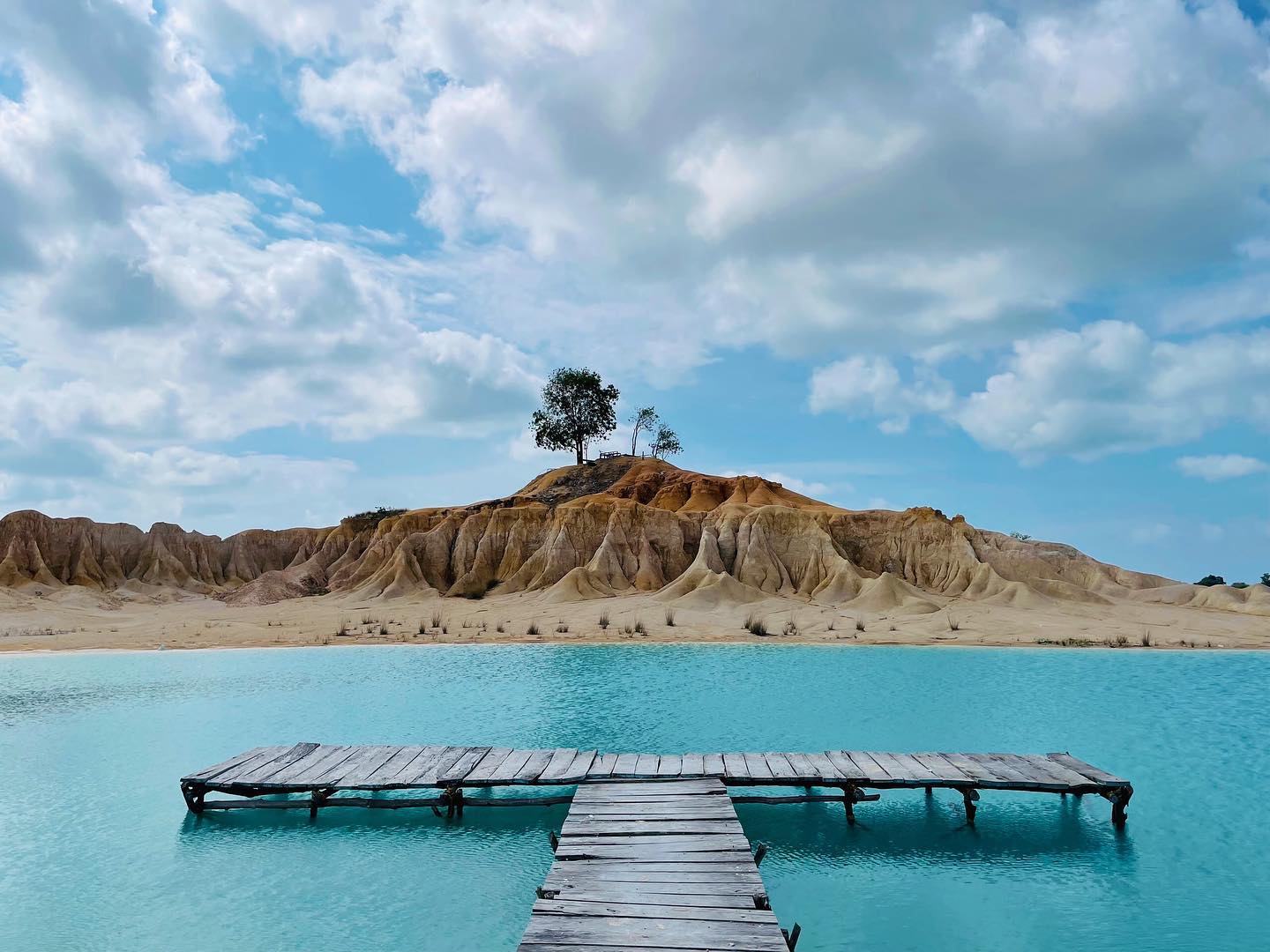 A quiet lagoon that’s tucked away and amidst white sand. That’s what Danau Biru is. Oddly enough, it’s not a natural occurrence, but more a by-product of mining activities.