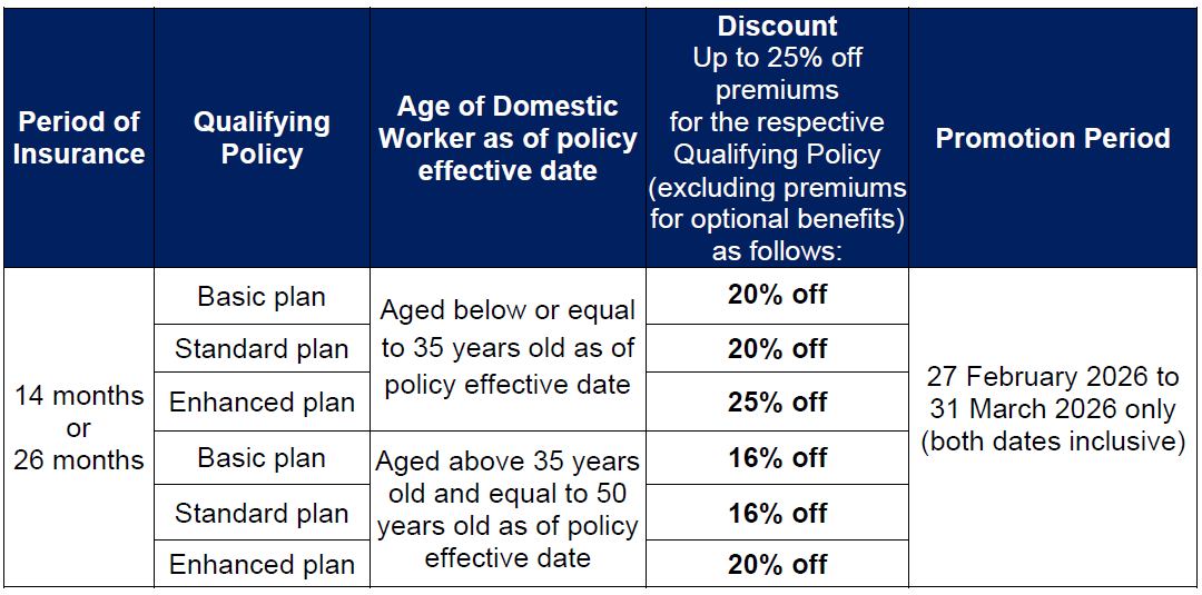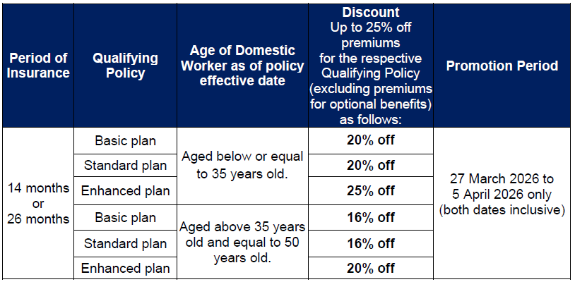 | Period of Insurance | Qualifying Policy | Age of Domestic Worker as of policy effective date | Discount Up to 25% off premiums for the respective Qualifying Policy (excluding premiums for optional benefits) as follows | Promotion Period |