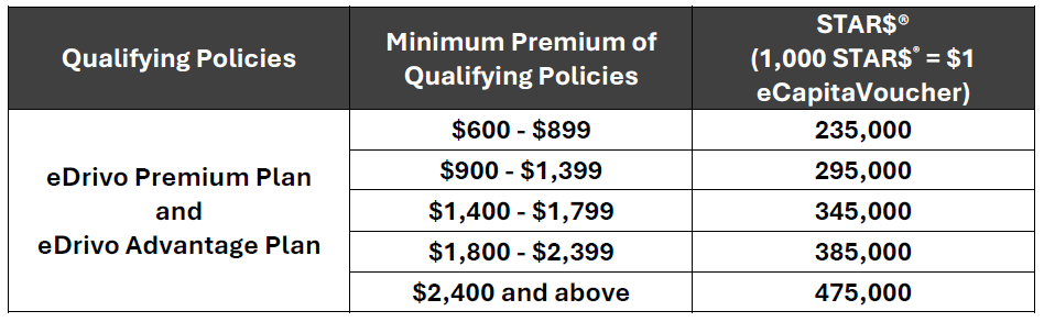 Qualifying Policies | Minimum Annual Premium | STAR$® (1,000 STAR$® = $1 eCapitaVoucher) |