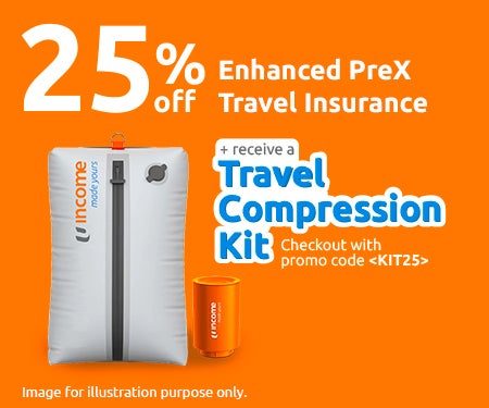 Get 25% off when you purchase your Enhanced PreX Per-trip Travel Insurance plans! Plus, receive a complimentary Travel Compression Kit^. Simply apply promo code ‘KIT25’ upon checkout. Promotion valid from 29 Dec 09:00hrs to 31 Dec 2025 09:00hrs!