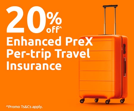 Get 20%^ off when you purchase Enhanced PreX Per-trip Travel Insurance plans from 18 Dec 09:00hrs to 29 Dec 2025 09:00hrs!