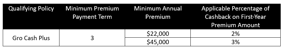 ^Cashback is applicable to first-year premiums only. To qualify for the Cashback, you must purchase a Gro Cash Plus policy, including any applicable rider(s) (“Qualifying Policy”) during the promotion period and meet the corresponding minimum annual premium as set out above. Each Qualifying Customer is entitled to receive the Cashback once per Qualifying Policy. Other promotion terms and conditions apply.