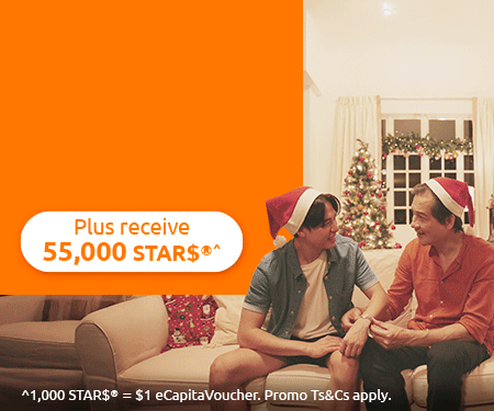 ^ 1,000 STAR$® = $1 eCapitaVoucher. To qualify for the perpetual premium discount and STAR$®, you must purchase a TermLife Solitaire policy, including any applicable rider(s) (“Qualifying Policy”) during the promotion period, meet the corresponding minimum annual premium (if applicable) as set out above. Each Qualifying Customer is entitled to receive the perpetual premium discount and STAR$® once per Qualifying Policy. Other promotion terms and conditions apply.