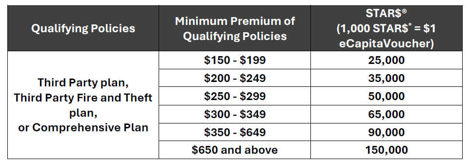[2]The STAR$® is only available for successful eligible applicants who have purchased Third Party plan, Third Party Fire and Theft plan or Comprehensive Plan, and each policyholder will be entitled denomination of STAR$® stated in the terms and conditions. Subject to Income's underwriting decision.