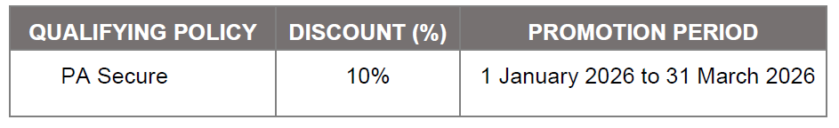 Enjoy 10%^ off your premiums when you sign up for any plan under PA Secure from now till 31 March 2026.