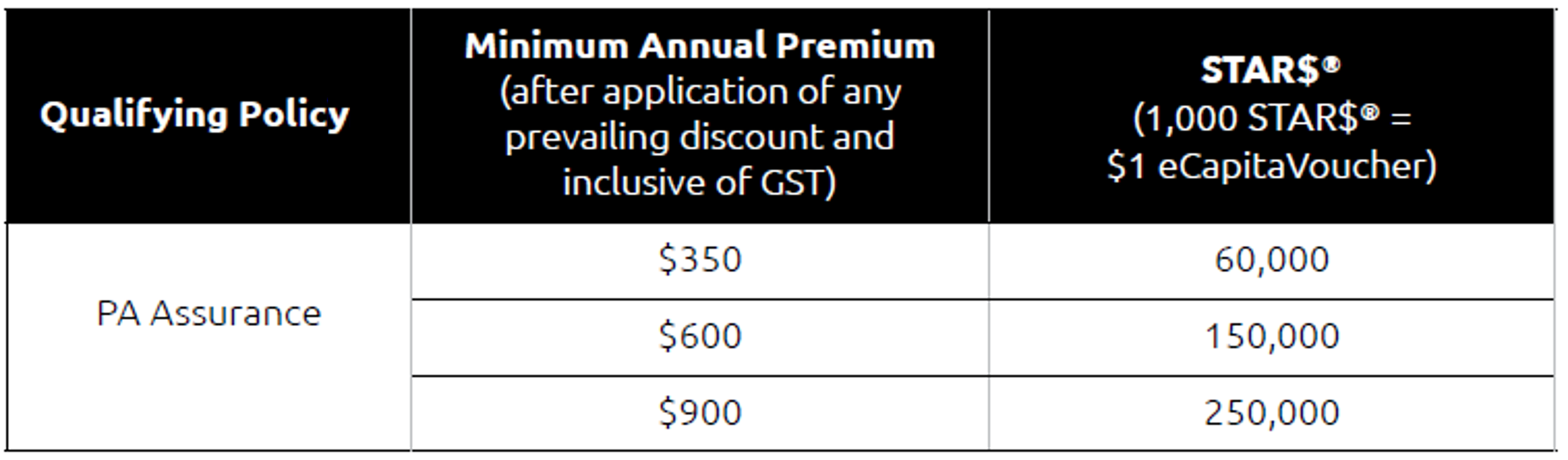 ^1,000 STAR$® = $1 eCapitaVoucher. To qualify for the STAR$®, you have to sign up for PA Assurance Insurance during the promotion period and meet the corresponding minimum annual premium. Only available for premium payment by way of yearly mode. Please refer to the terms and conditions for details of the promotion.