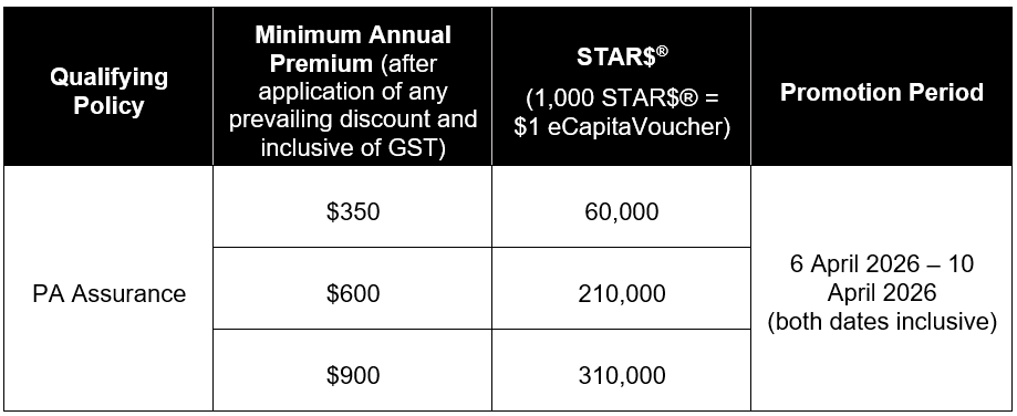 ^1,000 STAR$® = $1 eCapitaVoucher. To qualify for the STAR$®, you have to sign up for PA Assurance Insurance during the promotion period and meet the corresponding minimum yearly premium. Only available for premium payment by way of yearly mode. Please refer to the terms and conditions for details of the promotion.