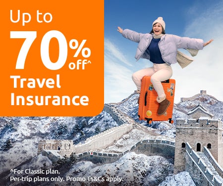 Enjoy up to 70%^ off when you purchase Standard Per-trip Travel Insurance plans from 11 Dec 09:00hrs to 16 Dec 2025 09:00hrs!