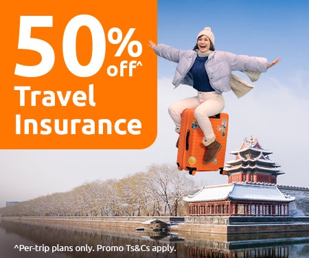 Enjoy 50%^ off when you sign up for your Standard Per-trip Travel Insurance plans from 31 Dec 2025 09:00hrs to 6 Jan 2026 09:00hrs!